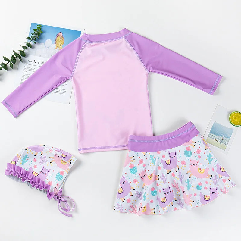Girls Long Sleeve and Skirt Swimsuit with swim bonnet